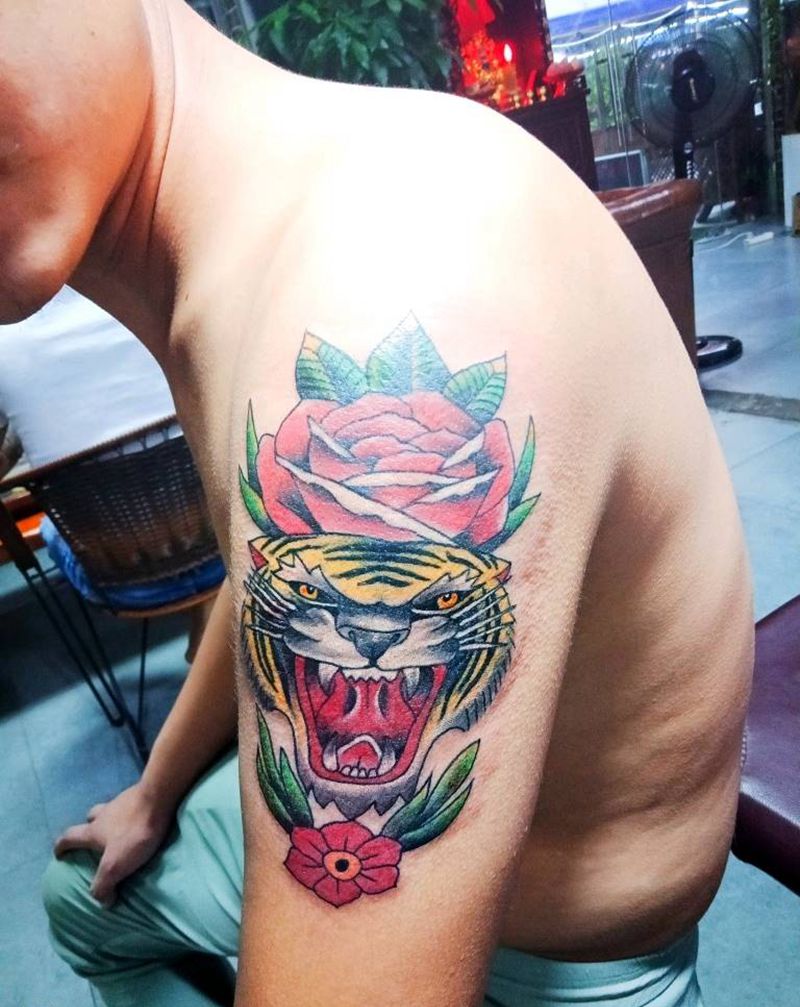 当前位置: 首页 >广西南宁市纹身店-墨徒纹身工作室纹身图案>老虎纹身图片_手臂Old SchoolNew School老虎花纹身图案