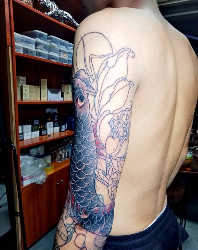 当前位置: 首页 >广西南宁市纹身店-墨徒纹身工作室纹身图案>花臂遮盖纹身图片_手臂新传统老传统鲤鱼纹身图案