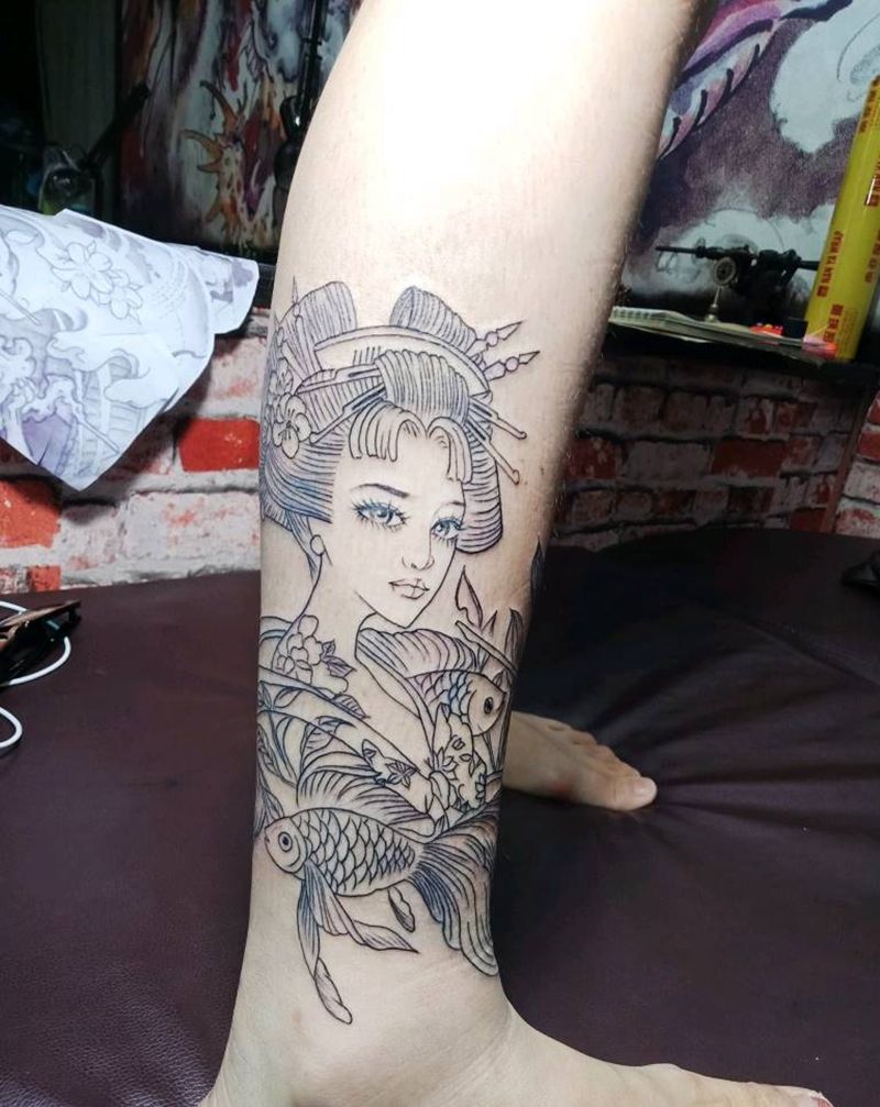 当前位置: 首页 >广西南宁市纹身店-墨徒纹身工作室纹身图案>艺伎纹身图片_腿部手臂新传统欧美写实艺伎金鱼纹身图案
