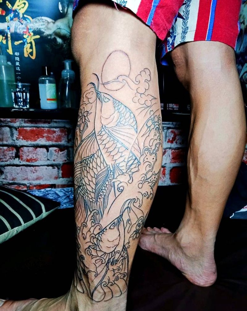 当前位置: 首页 >广西南宁市纹身店-墨徒纹身工作室纹身图案>金龙鱼纹身图片_腿部手臂新传统老传统金龙鱼纹身图案