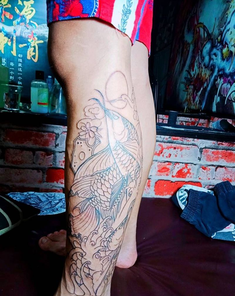 当前位置: 首页 >广西南宁市纹身店-墨徒纹身工作室纹身图案>金龙鱼纹身图片_腿部手臂新传统老传统金龙鱼纹身图案