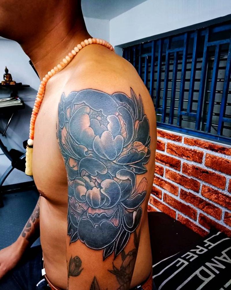 当前位置: 首页 >广西南宁市纹身店-墨徒纹身工作室纹身图案>遮盖牡丹纹身图片_手臂脚部新传统Old School遮盖牡丹黑灰纹身图案