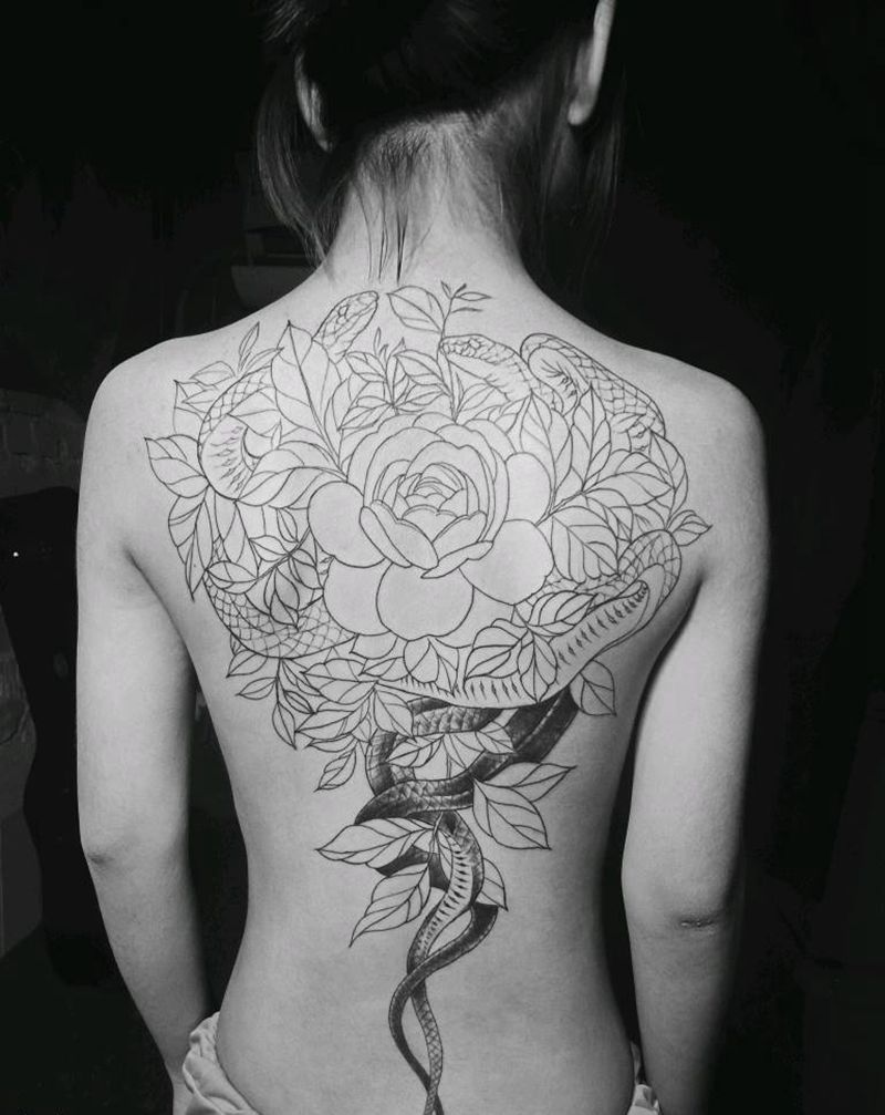 满背线条纹身图片_背部腰部欧美写实点刺素花满背欧美纹身图案