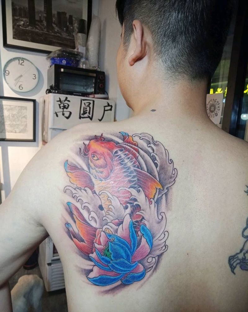 半背锦鲤纹身图片_背部胸部新传统老传统鲤鱼纹身图案