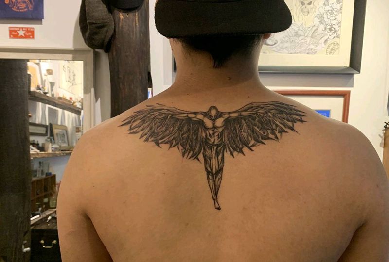 当前位置: 首页 >广西南宁市纹身店-墨徒纹身工作室纹身图案>天使纹身图片_背部几何点刺天使纹身图案