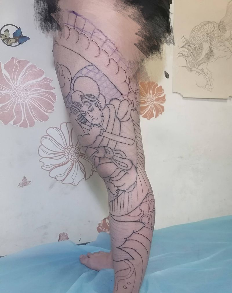 • T网红王老大花腿龙纹身图片_腿部新传统纹身图案