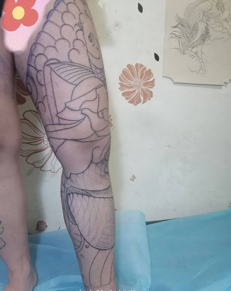 • T网红王老大花腿龙纹身图片_腿部新传统纹身图案