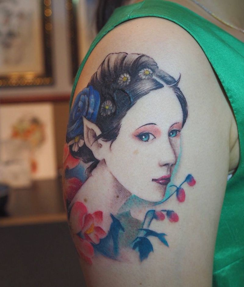 美女和美女的纹身纹身图片_手臂欧美人物原创植物静物成品肖像写实清新纹身图案
