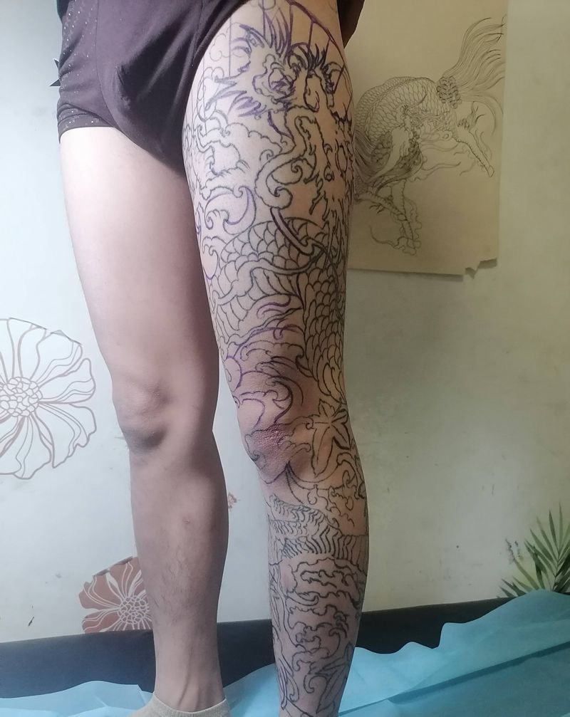 当前位置: 首页 >广西南宁市纹身店-彫學長刺青纹身图案>修改失败花腿龙纹身图片_腿部老传统纹身图案