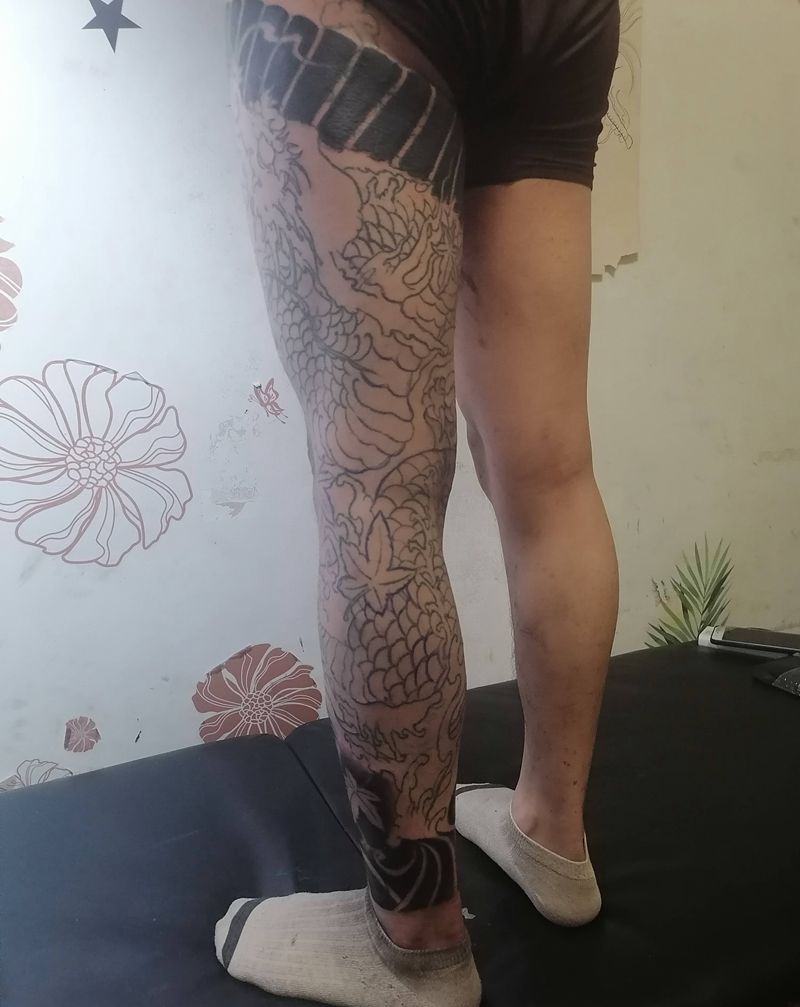 当前位置: 首页 >广西南宁市纹身店-彫學長刺青纹身图案>修改失败花腿龙纹身图片_腿部老传统纹身图案