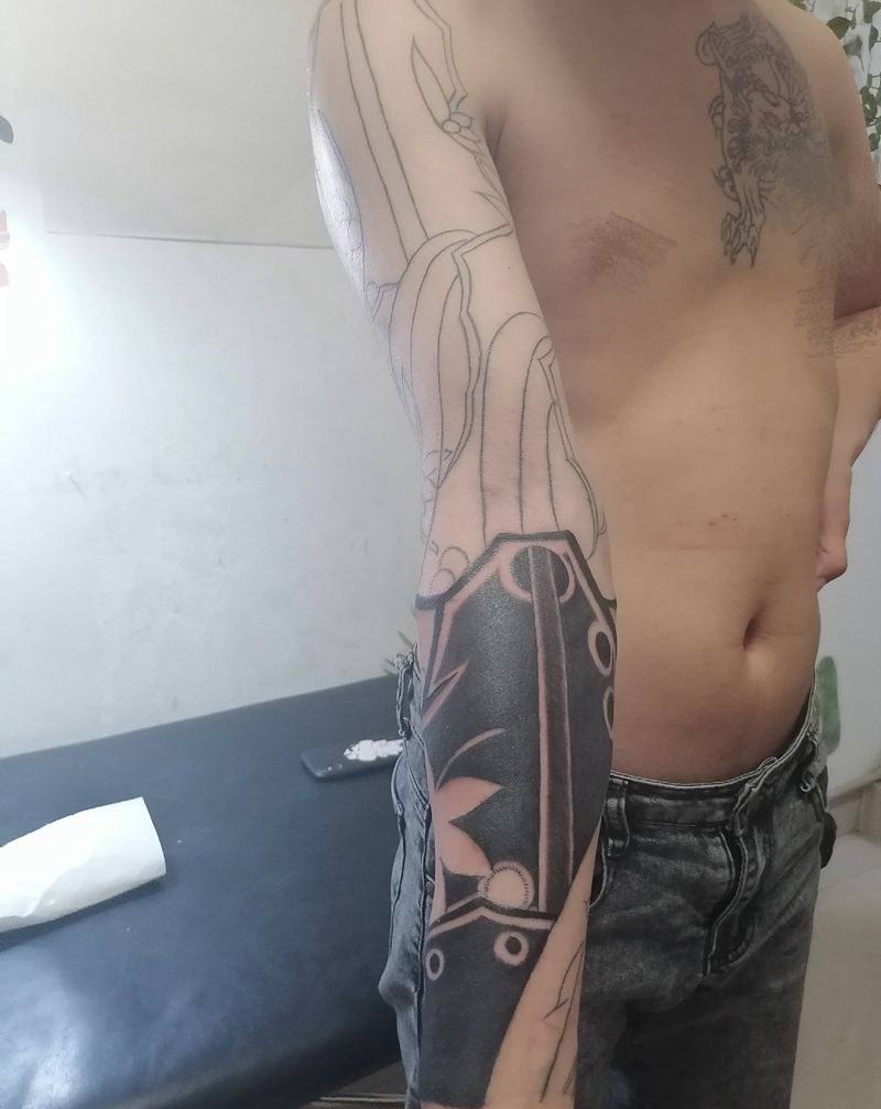 当前位置: 首页 >广西南宁市纹身店-彫學長刺青纹身图案>(原创浪臂)开始上色咯纹身图片_手臂纹身图案