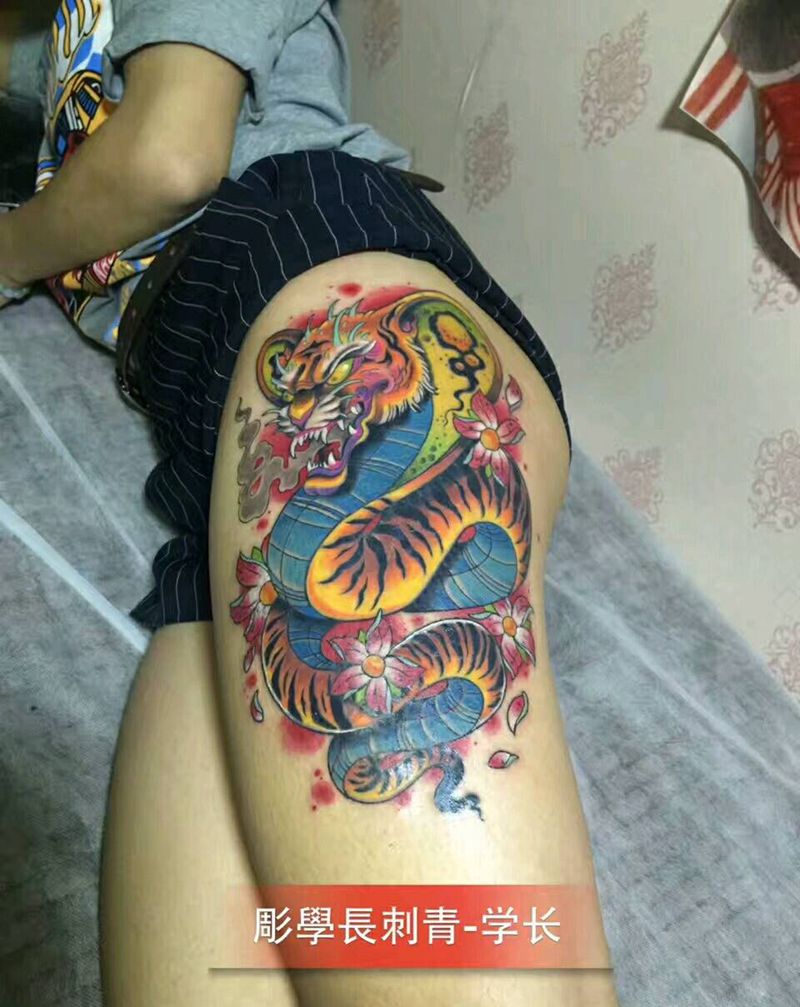 • T网红王老大花腿龙纹身图片_腿部新传统纹身图案
