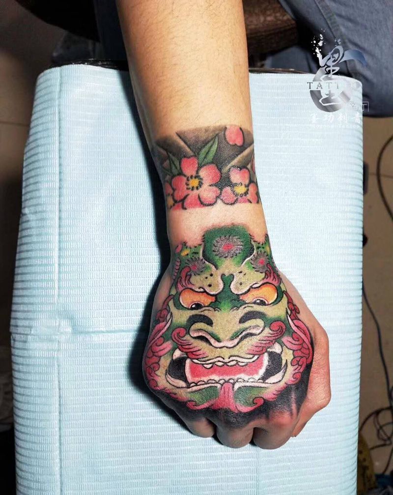 当前位置: 首页 >广西南宁市纹身店-墨功刺青纹身图案>手背,个性唐狮子纹身图片