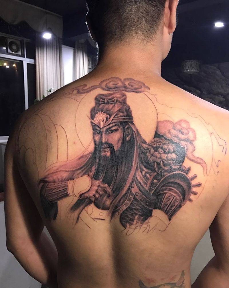 当前位置: 首页 >广西南宁市纹身店-墨功刺青纹身图案>满背关公遮盖纹身图片