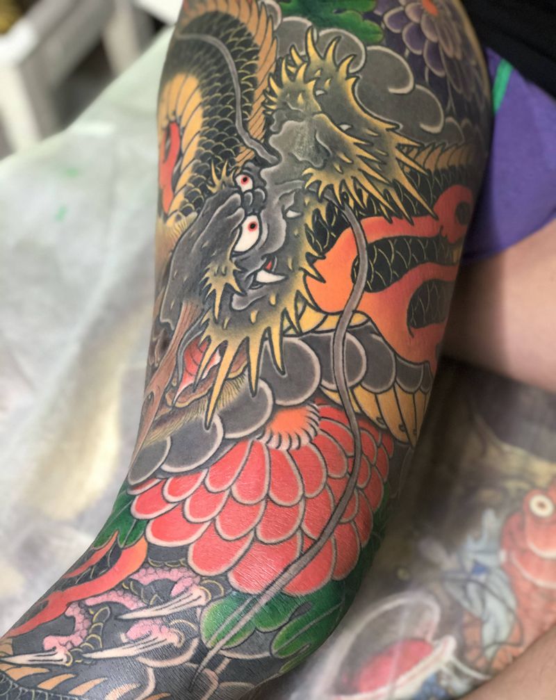 • T网红王老大花腿龙纹身图片_腿部新传统纹身图案
