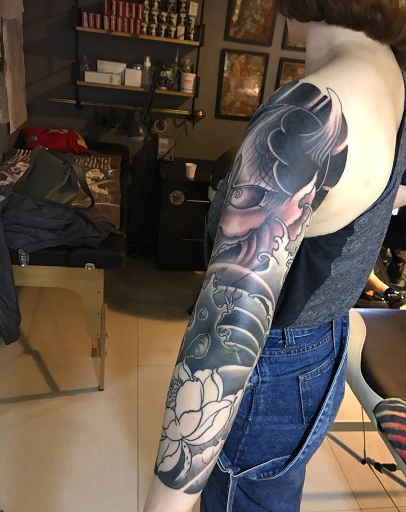 当前位置: 首页 >广西南宁市纹身店-云鹤刺青纹身店纹身图案>半胛七分般若纹身图片_手臂胸部传统人物静物植物原创刺青纹身图案