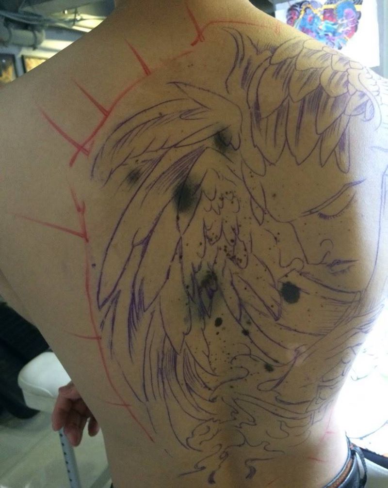 当前位置: 首页 >广西南宁市纹身店-云鹤刺青纹身店纹身图案>黑灰天使纹身图片_成品背部欧美人物字符图腾鬼神纹身图案