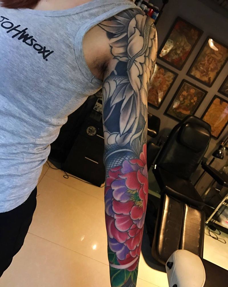当前位置: 首页 >广西南宁市纹身店-云鹤刺青纹身店纹身图案>蛇戏牡丹纹身图片_手臂手部传统国画原创植物动物纹身图案