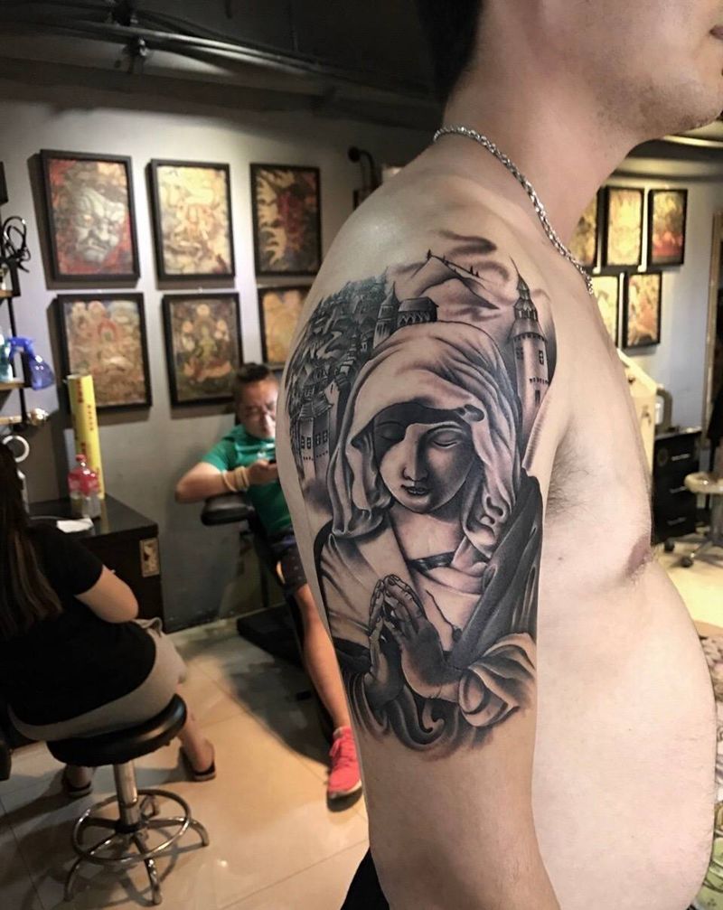 当前位置: 首页 >广西南宁市纹身店-云鹤刺青纹身店纹身图案>圣母纹身图片_成品手稿手臂传统写实肖像人物宗教纹身图案