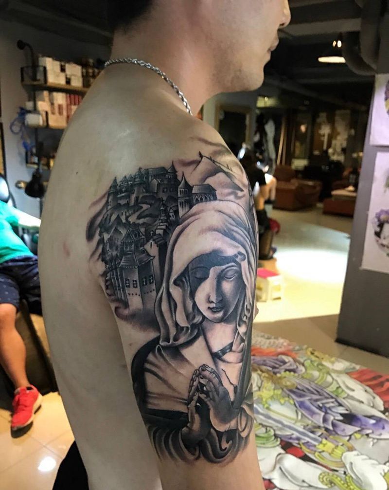 当前位置: 首页 >广西南宁市纹身店-云鹤刺青纹身店纹身图案>圣母纹身图片_成品手稿手臂传统写实肖像人物宗教纹身图案