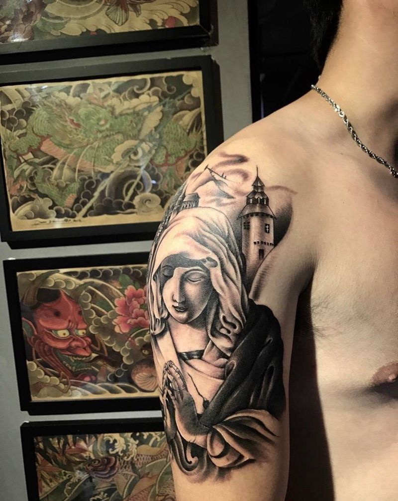 当前位置: 首页 >广西南宁市纹身店-云鹤刺青纹身店纹身图案>圣母纹身图片_成品手稿手臂传统写实肖像人物宗教纹身图案