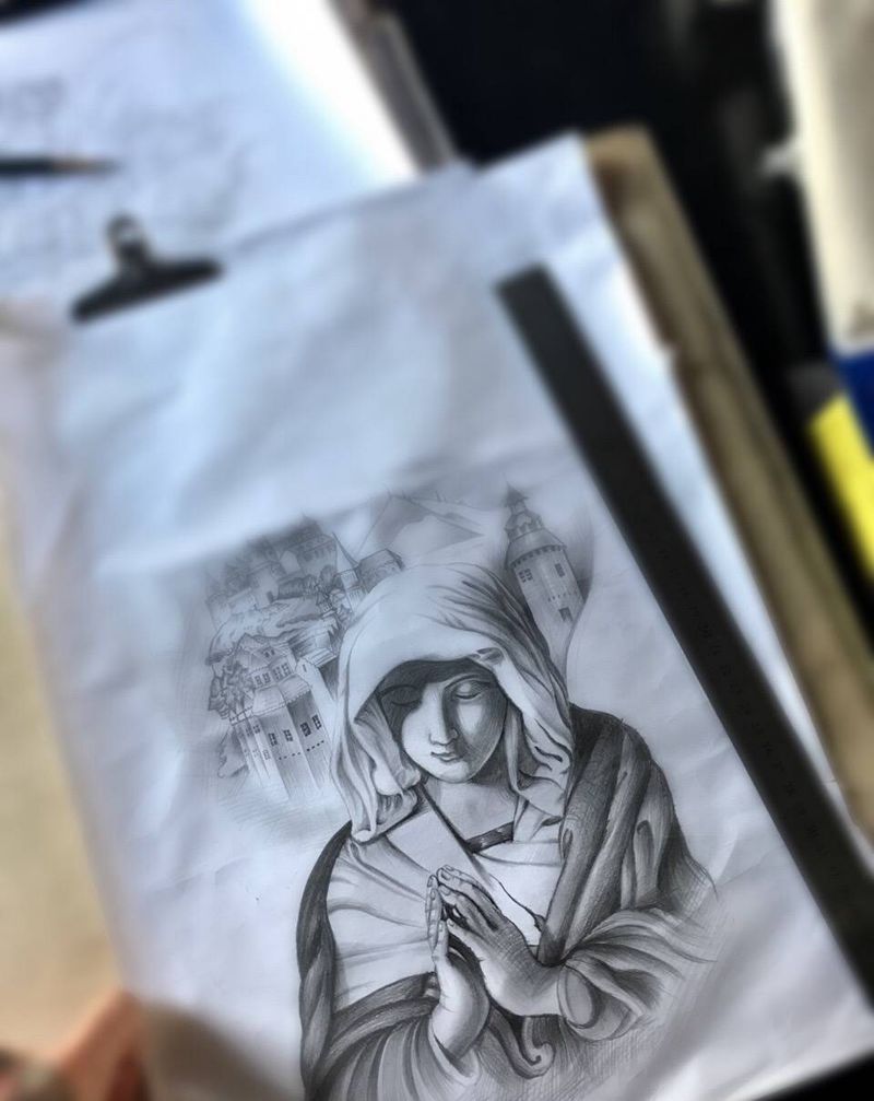 当前位置: 首页 >广西南宁市纹身店-云鹤刺青纹身店纹身图案>圣母纹身图片_成品手稿手臂传统写实肖像人物宗教纹身图案