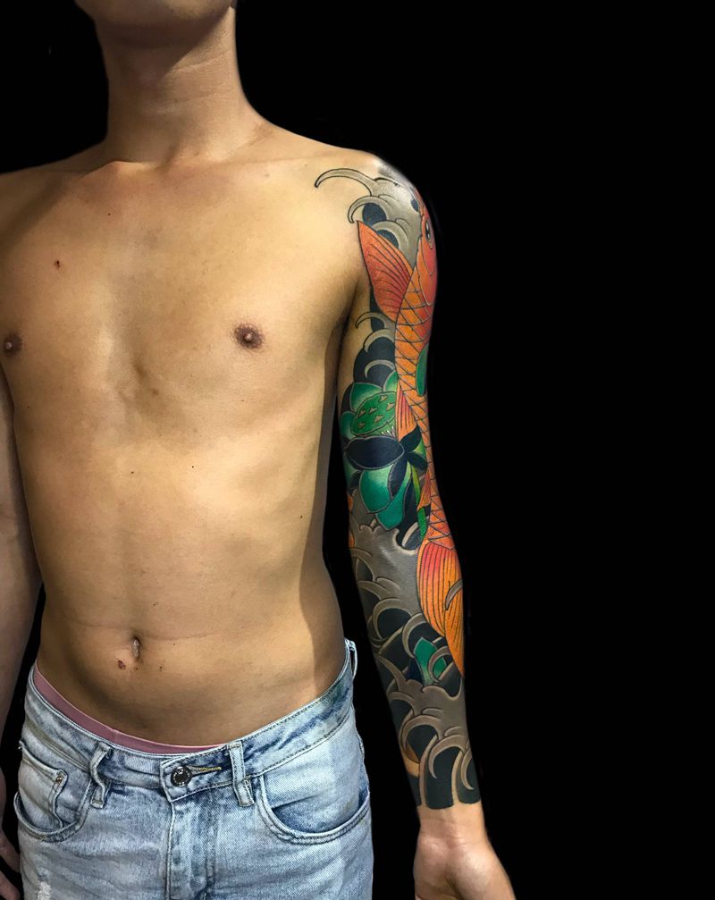 当前位置: 首页 >广西南宁市纹身店-云鹤刺青纹身店纹身图案>传统花臂鲤鱼纹身图片_手臂手部老传统新传统纹身图案