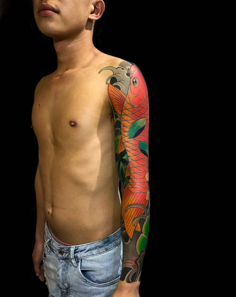当前位置: 首页 >广西南宁市纹身店-云鹤刺青纹身店纹身图案>传统花臂鲤鱼纹身图片_手臂手部老传统新传统纹身图案