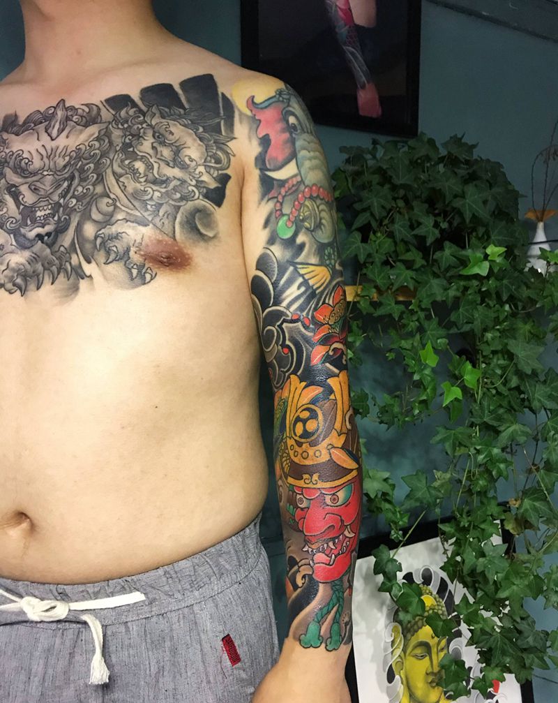 当前位置: 首页 >广西南宁市纹身店-云鹤刺青纹身店纹身图案>传统花臂拼接,鬼武士纹身图片_手臂手部老传统新传统纹身图案