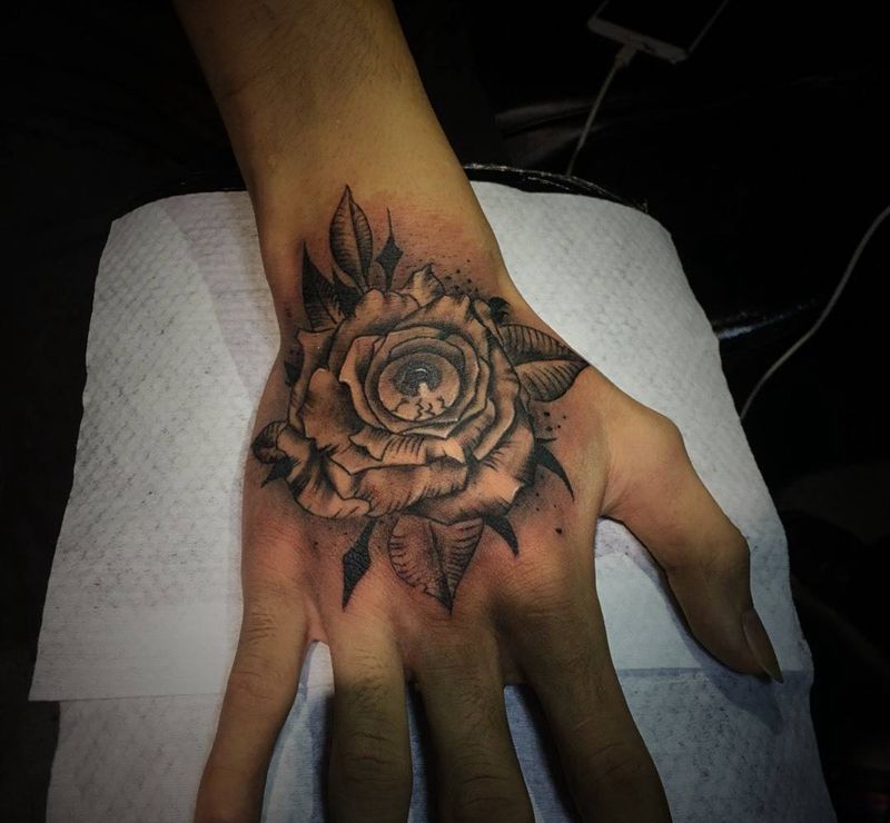 • 手背潮流时尚的玫瑰花眼睛纹身图案