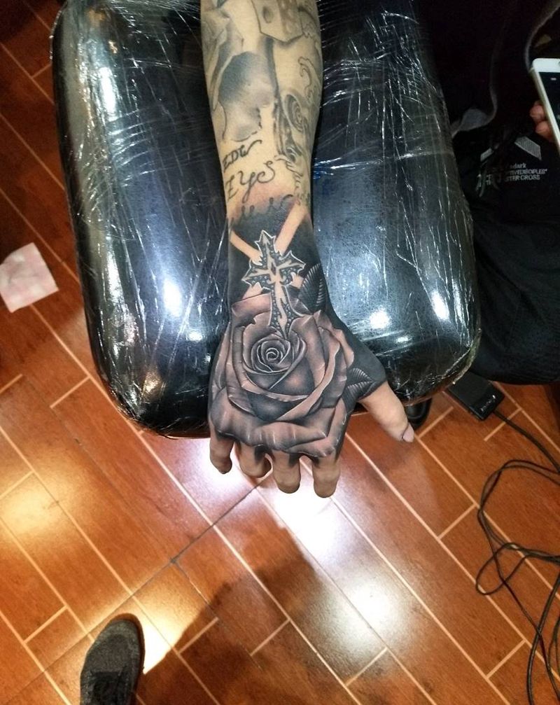 玫瑰手背设计 (十字架是旧图纹身图片