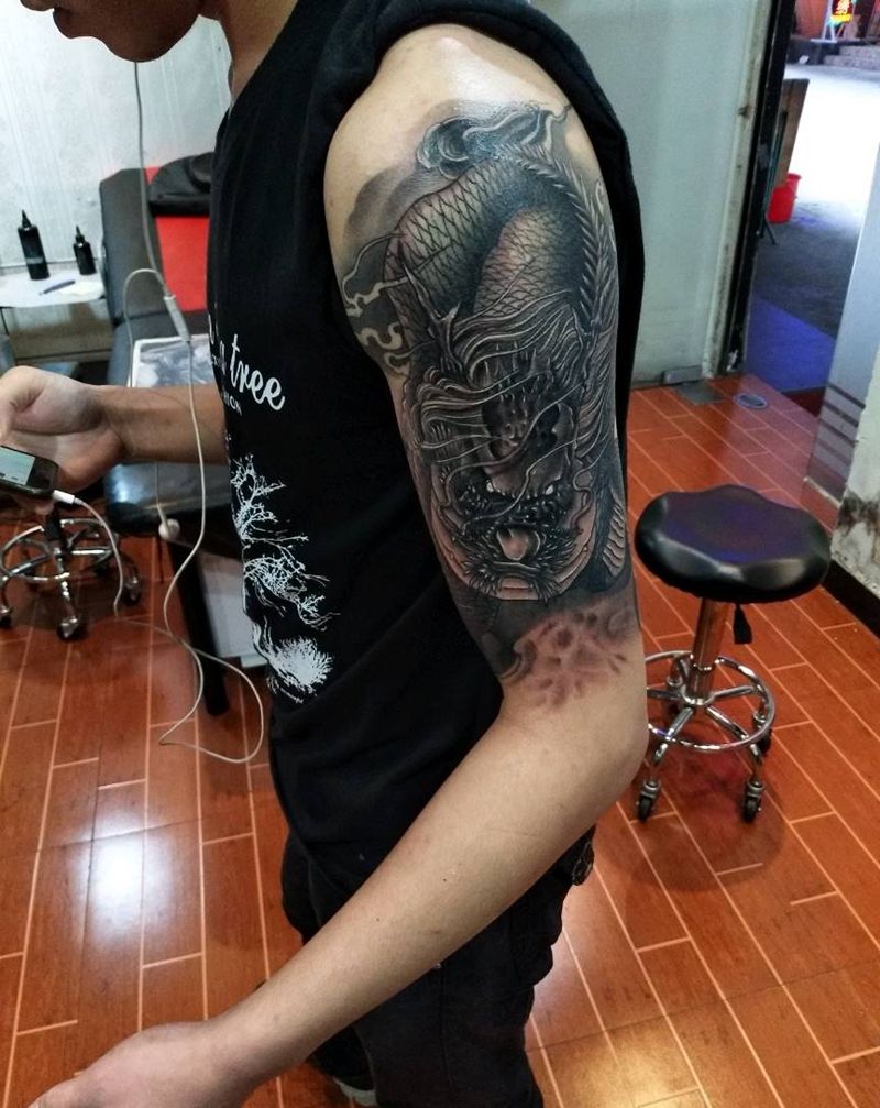 • T网红王老大花腿龙纹身图片_腿部新传统纹身图案