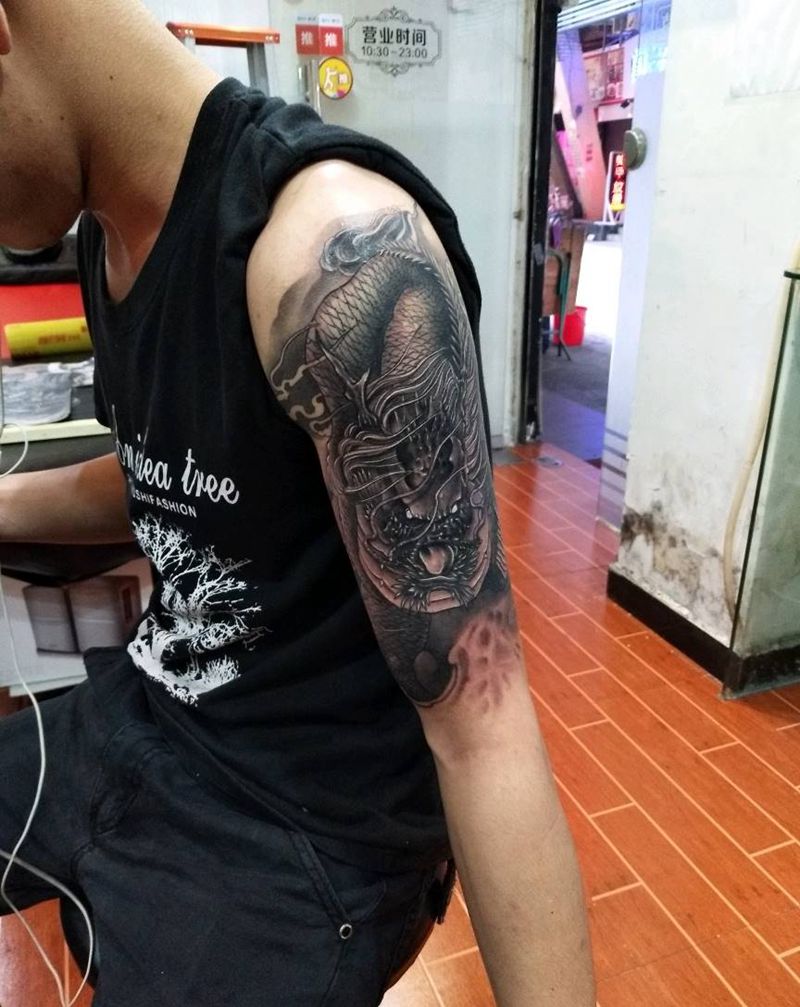 • T网红王老大花腿龙纹身图片_腿部新传统纹身图案