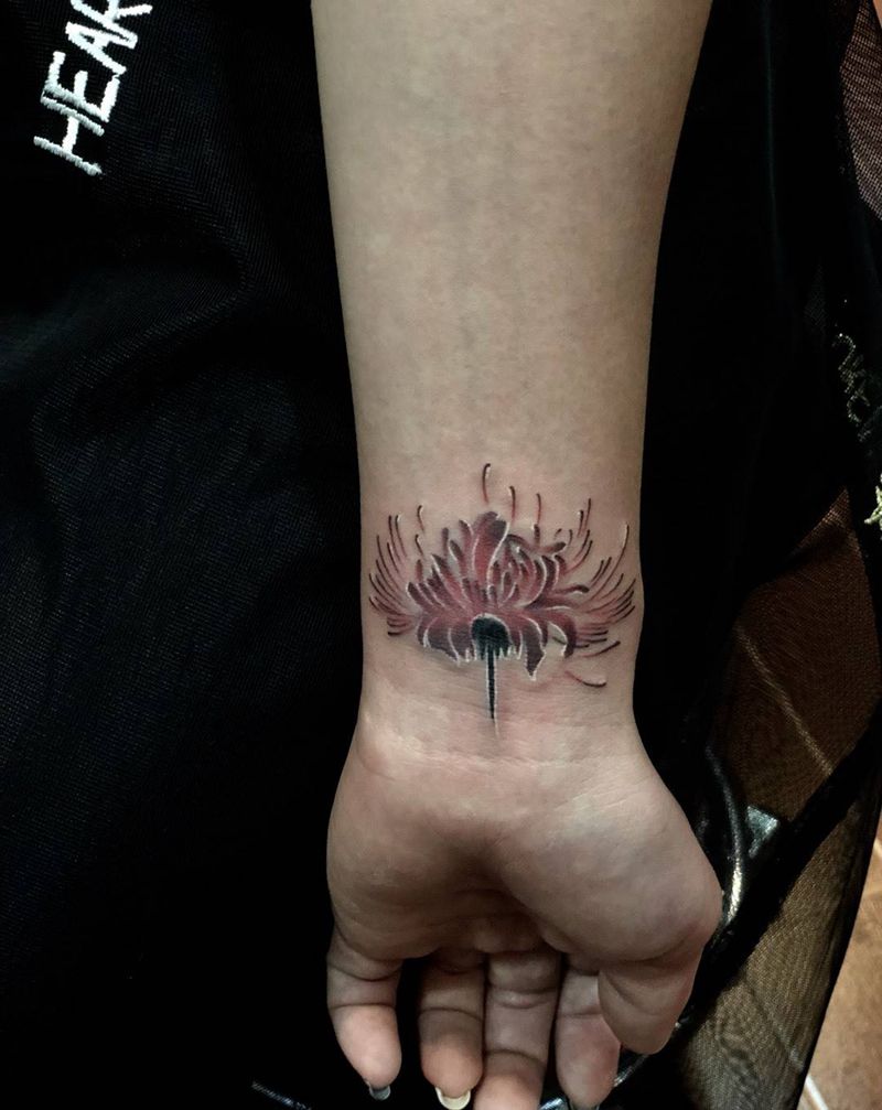 当前位置: 首页 >广西柳州市纹身店-如梦令刺青文化纹身图案>彼岸花 遮盖旧图案纹身图片