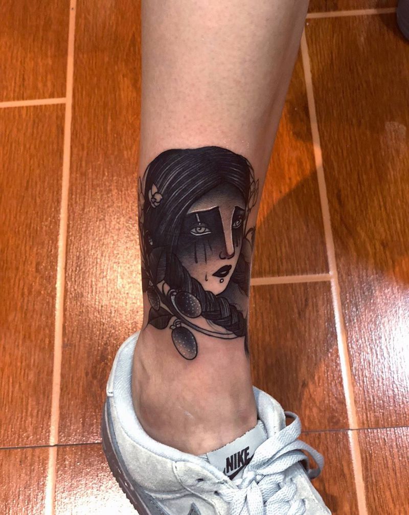 • T包小腿吹火男+阿多福纹身图片_腿部老传统新传统吹火男阿