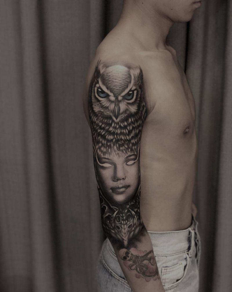 当前位置: 首页 >广西柳州市纹身店-如梦令刺青文化纹身图案>欧美写实纹身图片_手臂欧美写实猫头鹰 人物纹身图案