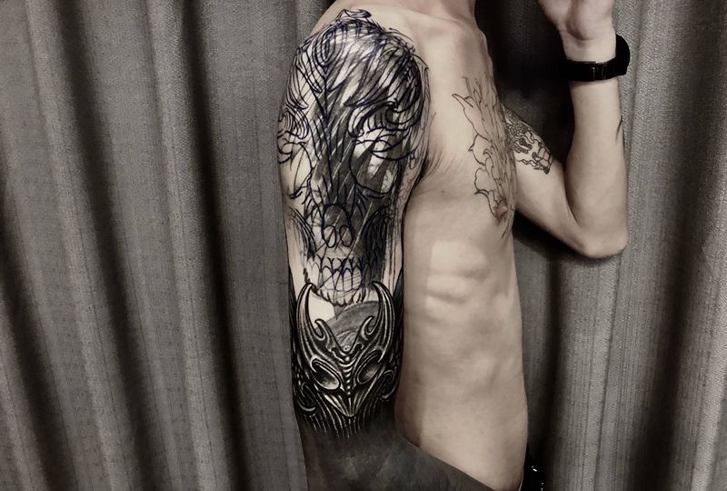 当前位置: 首页 >广西柳州市纹身店-如梦令刺青文化纹身图案>《暗黑骷髅遮盖》纹身图片_手臂欧美写实暗黑骷髅纹身图案