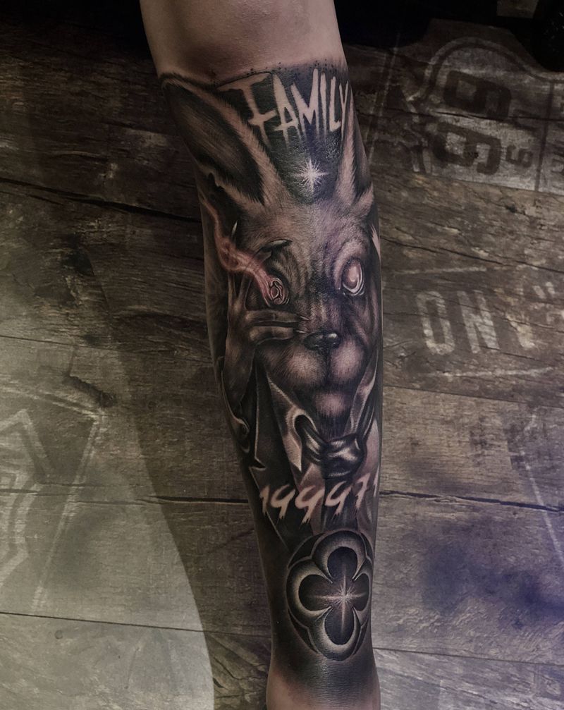当前位置: 首页 >广西柳州市纹身店-如梦令刺青文化纹身图案>欧美写实纹身图片_腿部欧美写实兔纹身图案