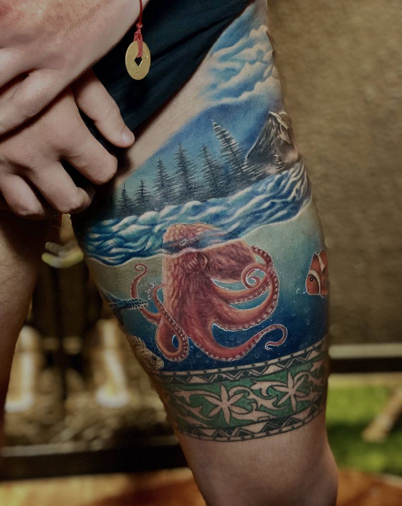 当前位置: 首页 >广西柳州市纹身店-如梦令刺青文化纹身图案>写实纹身图片_腿部欧美写实海洋纹身图案