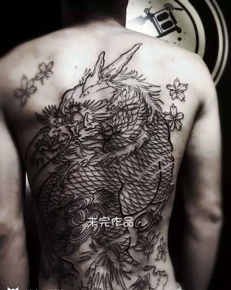 麒麟纹身图片_传统动物背部未完作品纹身图案