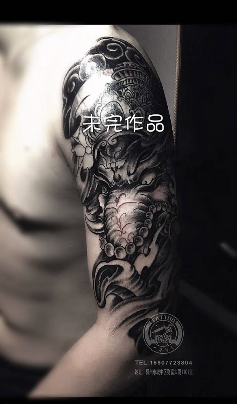 当前位置: 首页 >广西柳州市纹身店-福雕刺青纹身图案>象神-覆盖图纹身图片_手臂传统动物未完作品纹身图案