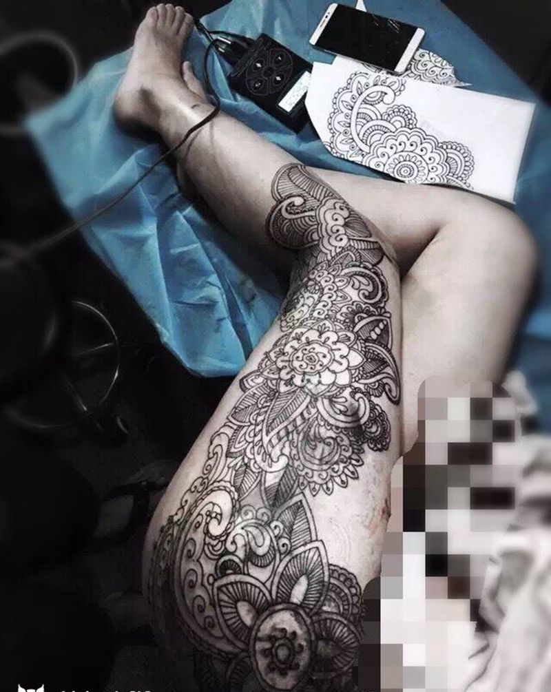 曼陀罗纹身图片_成品图腾几何腿部欧美纹身图案