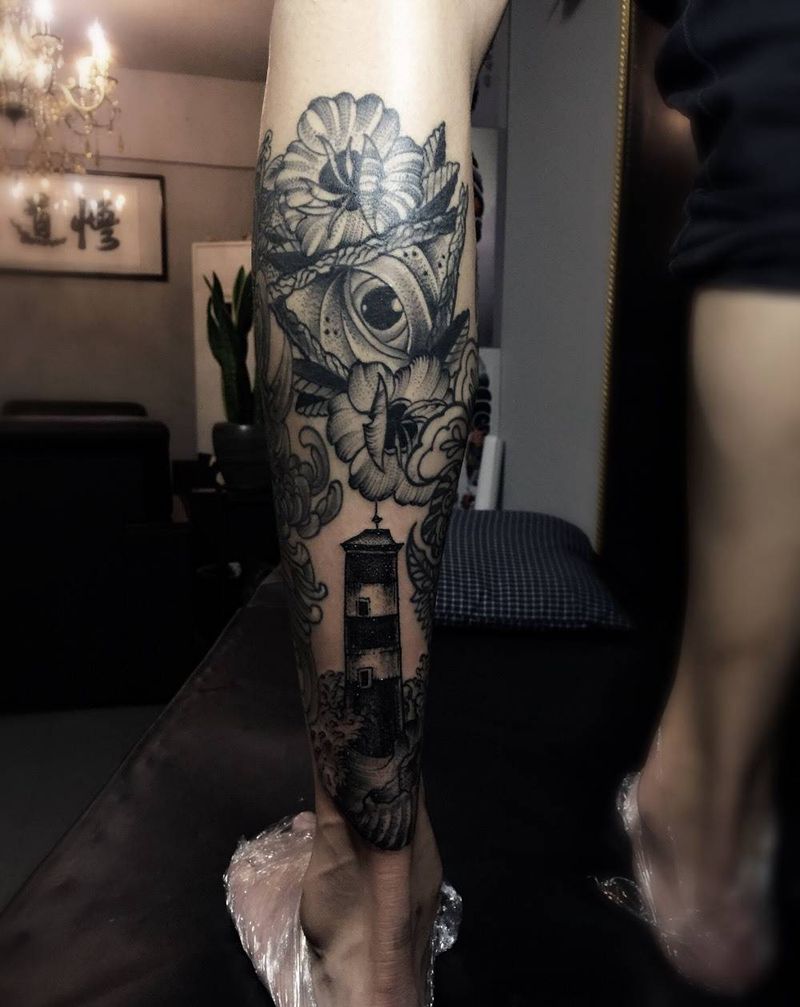 • T包小腿吹火男+阿多福纹身图片_腿部老传统新传统吹火男阿