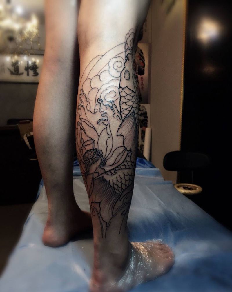• T网红王老大花腿龙纹身图片_腿部新传统纹身图案