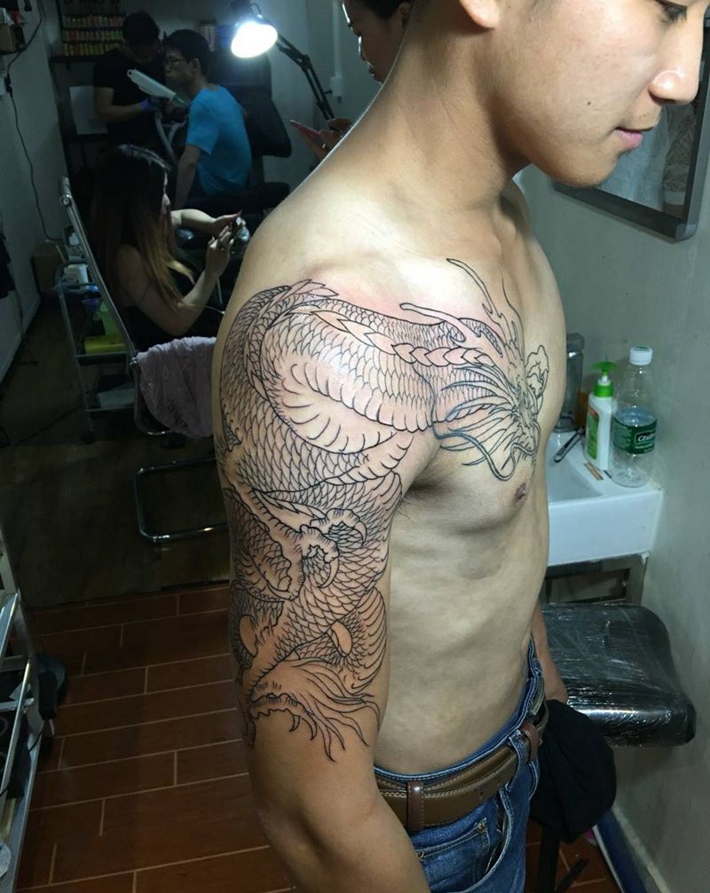 过肩龙纹身图片_胸部手臂传统动物纹身图案