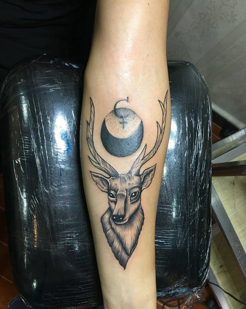 当前位置: 首页 >广西柳州市纹身店-如梦令刺青文化纹身图案>鹿头纹身图片_成品手臂传统动物纹身图案