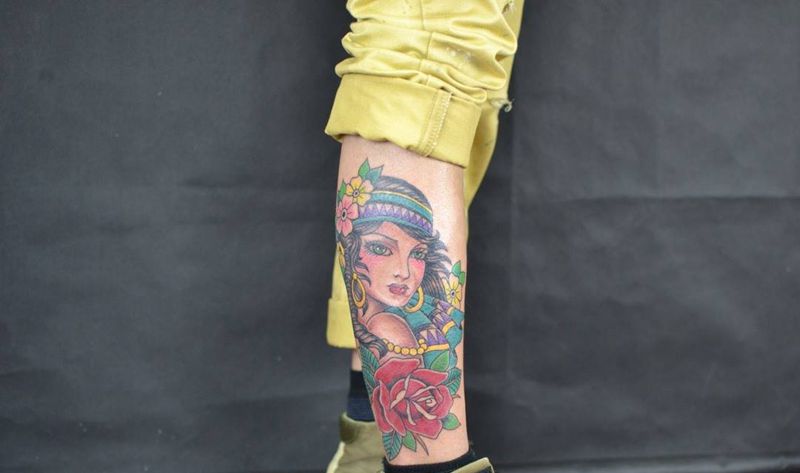 • T包小腿吹火男+阿多福纹身图片_腿部老传统新传统吹火男阿