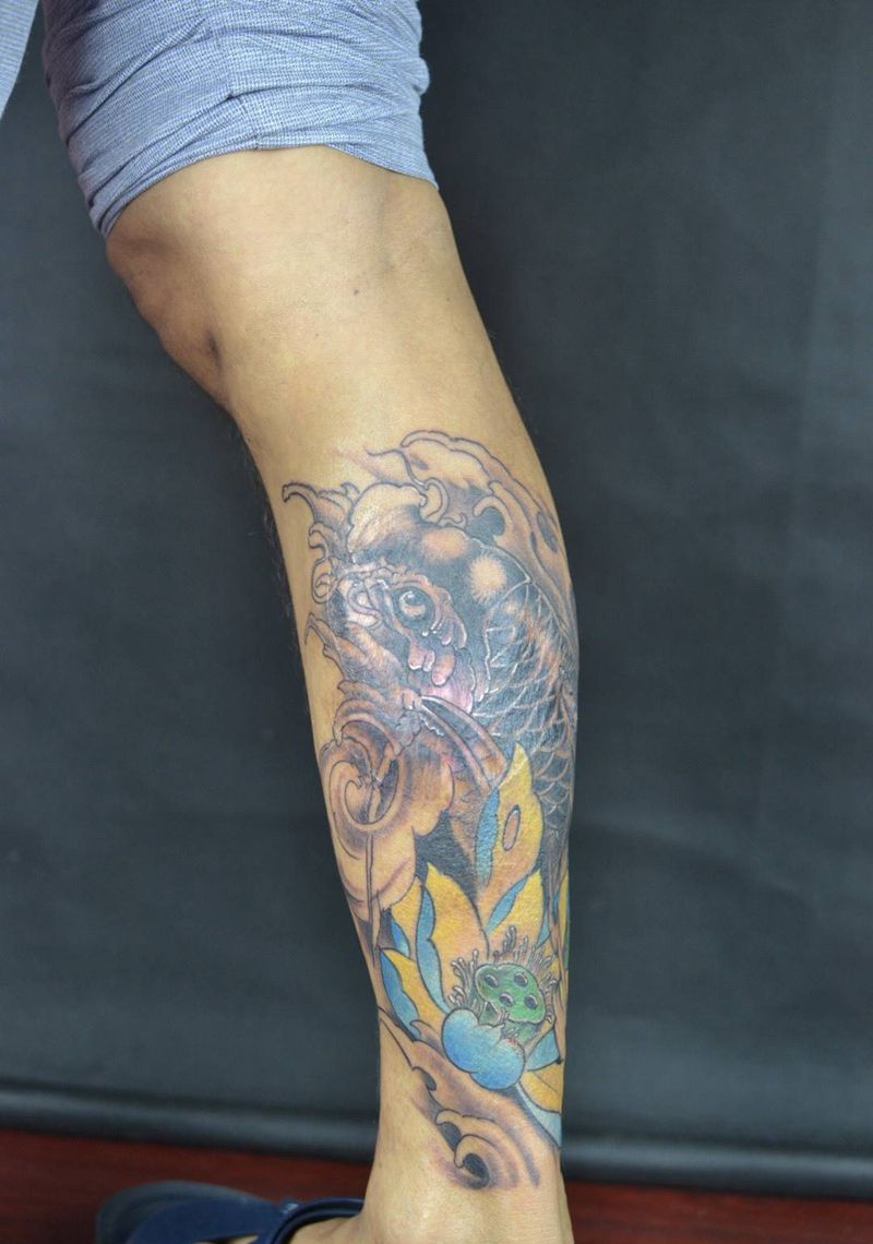 • T网红王老大花腿龙纹身图片_腿部新传统纹身图案