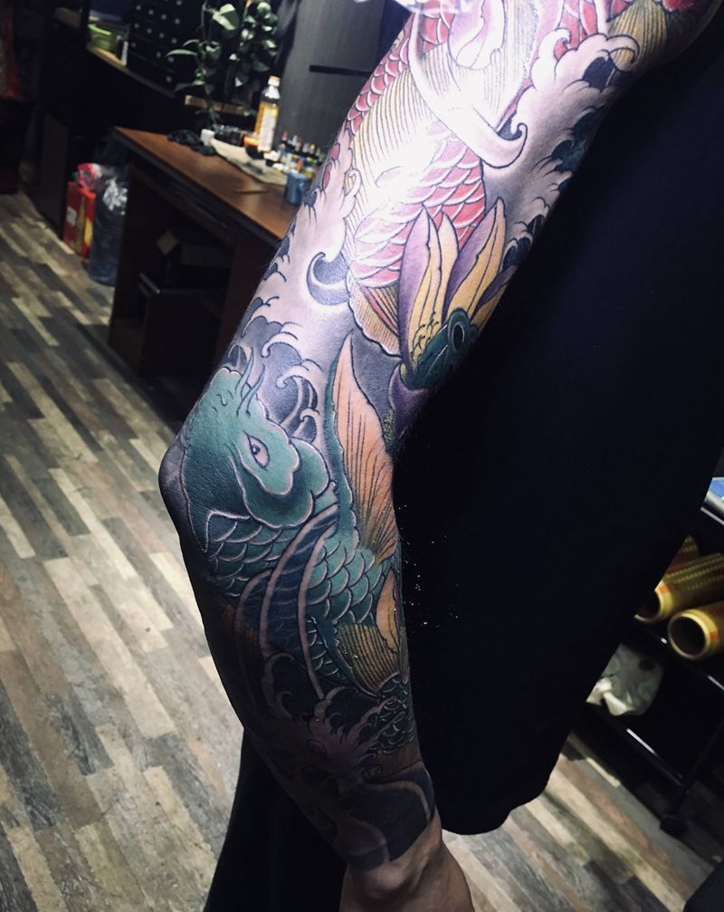 当前位置: 首页 >广西柳州市纹身店-念刺青工作室纹身图案>鲤鱼花臂纹身图片_手臂纹身图案