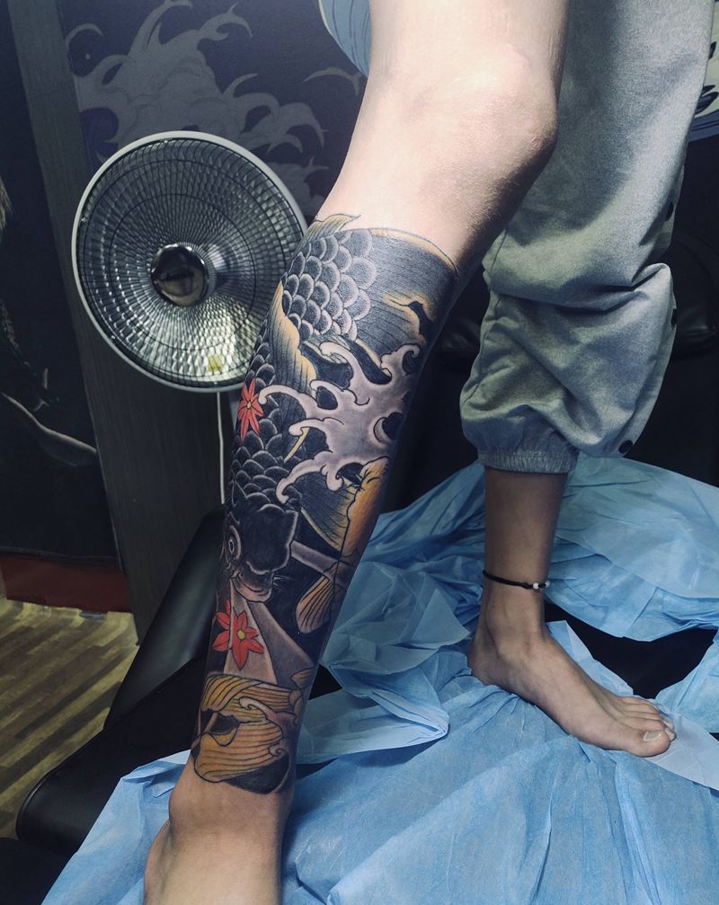 当前位置: 首页 >广西柳州市纹身店-念刺青工作室纹身图案>富贵鲤鱼纹身图片_腿部老传统鲤鱼纹身图案